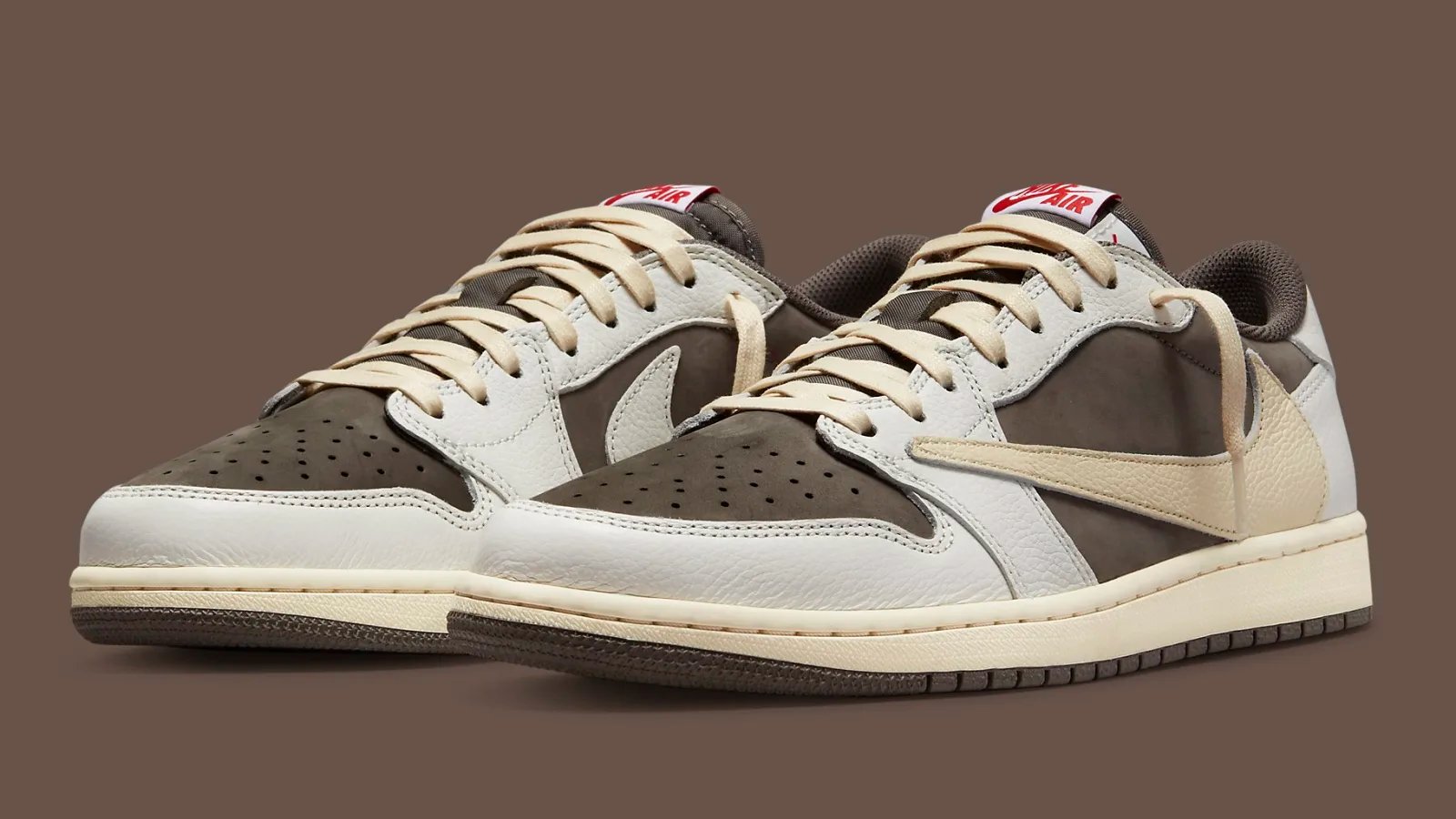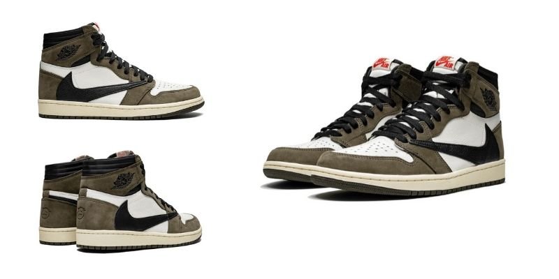 Air Jordan 1 Retro High OG SP 'Travis Scott Mocha' (2019) Uno de los modelos más icónicos, con un diseño de cuero blanco y gamuza Mocha, famoso por el Swoosh invertido. |